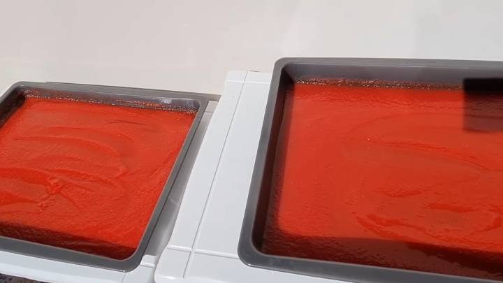 Получившуюся гладкую массу перелить на три противня нетолстым слоем. Выставить на балкон на солнце.