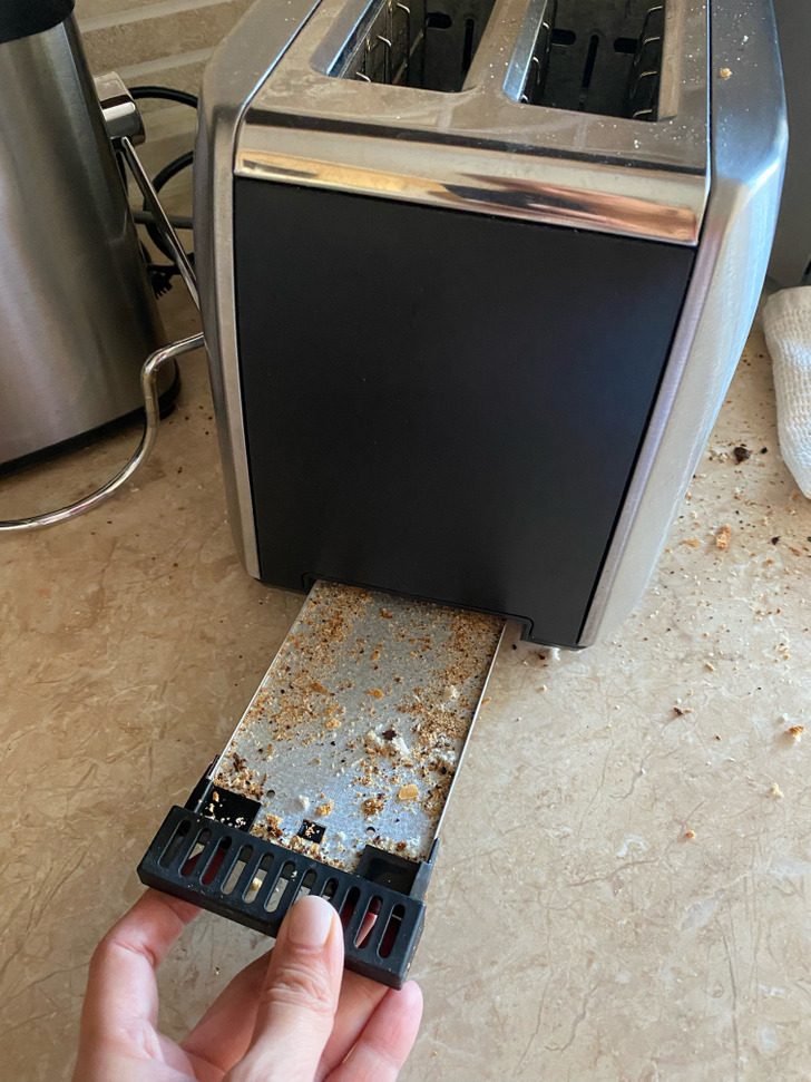 Крошки неизбежно скапливаются внутри тостера после каждого использования. А их избыток не только влияет на эффективность устройства, но и может привести к возгоранию. Поэтому следует отключать тостер от сети и удалять остатки хлеба каждый раз. И при этом не забывать вытаскивать выдвижную пластину, где копится большая часть остатков.