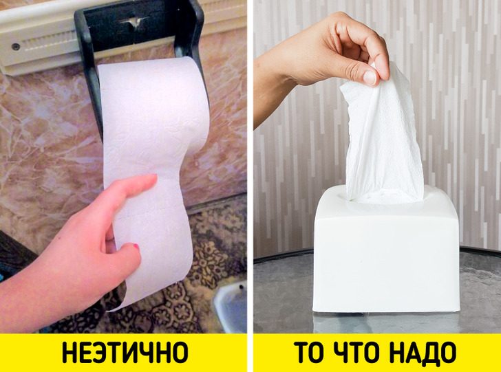 Порой, бегая по дому в поисках салфетки или носового платка, многие решают высморкаться в туалетную бумагу или вытереть ею рот после приема пищи. Однако лучше использовать бумагу лишь в пределах туалетной комнаты. Для прочих целей стоит расставить по дому коробки с салфетками, откуда их удобно вынимать.