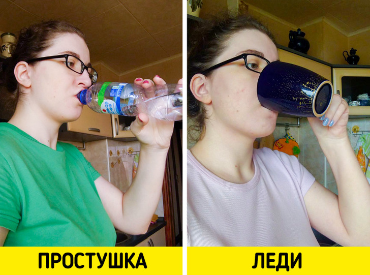 Есть мнение, что пить воду или другие напитки из бутылки, к тому же не оставляя между ртом и горлышком пространства для воздуха, — это некрасиво. Более того, если делать так наедине с собой, то можно быстро привыкнуть и позже опростоволоситься в общественном месте. Лучше сразу наливать напиток в стакан или чашку.