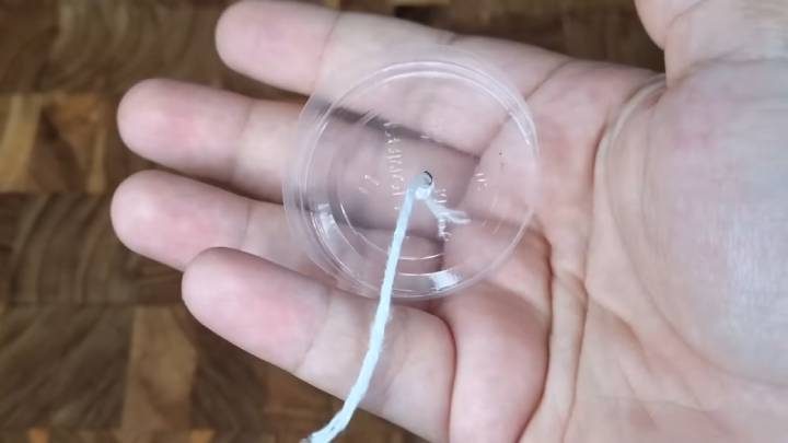 У пластикового стаканчика обрежьте дно, сделайте отверстие в центре.