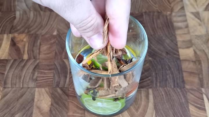 В стеклянную банку или стакан насыпьте специи: корицу (целую), гвоздику, бадьян. Сюда же порежьте пару ломтиков лимона или лайма, яблока, корки апельсина. Налейте воды на 1/2 стакана. До верха залейте растительным маслом.