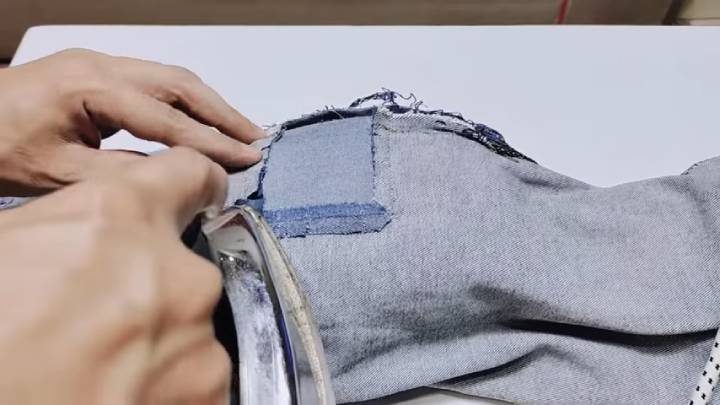 Подберите джинсовую ткань максимально в тон. Вырежьте из неё квадрат в два раза больше нарисованного вокруг дырки. Подверните с одного края ткань на 1 см, возьмите нитки в тон и вручную пришейте джинсовую ткань невидимым швом по одной стороне квадрата. Затем то же самое повторите по двум другим сторонам — слева и справа. Не зашивайте только с четвёртой стороны — стороны распоротого шва.