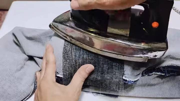 Возьмите термоклеевую заплатку (клеевую ткань для заплаток), приложите к дырке с обратной стороны, прогладьте. Клеевая ткань предпочтительней обычной паутинки, так как она более плотная и прочная — а джинсам нужен именно такой ремонт.