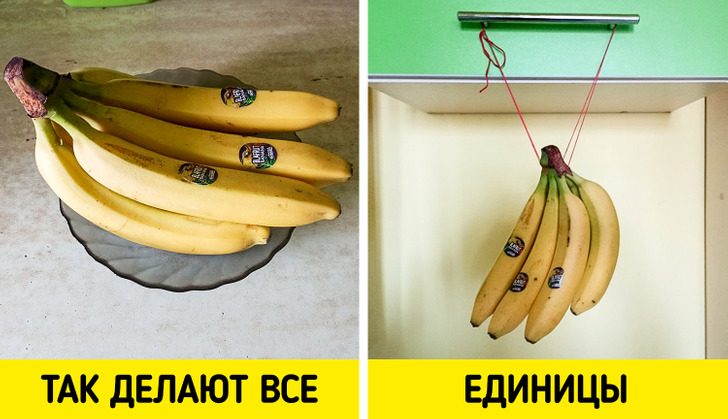 Одна из японских бытовых хитростей — хранить бананы в подвешенном виде. Дело в том, что эти фрукты очень чувствительны к давлению, поэтому, когда они лежат на поверхности, они портятся гораздо быстрее. А в тех местах, где плоды давят друг на друга, образуется коричневая мякоть. При вертикальном хранении это исключено.