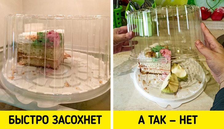 Остатки торта следует хранить в холодильнике в контейнере, чтобы десерт не впитал посторонние запахи. Однако даже под крышкой торт начнет подсыхать. Этот процесс можно замедлить, если положить в контейнер кусочек яблока.