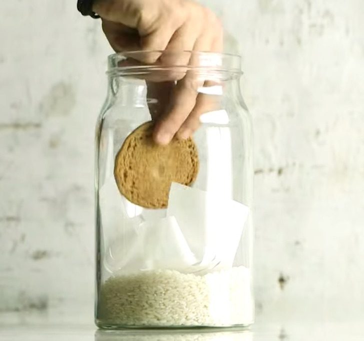 Популярный кулинарный блогер поделился своим секретом хранения печенья. На дно банки он насыпает рис, затем накрывает его листом пергамента, в котором предварительно проделывает надрезы, и помещает поверх бумаги печенье. Несложно догадаться, что рис будет впитывать лишнюю влагу, а значит, печенье дольше останется хрустящим.