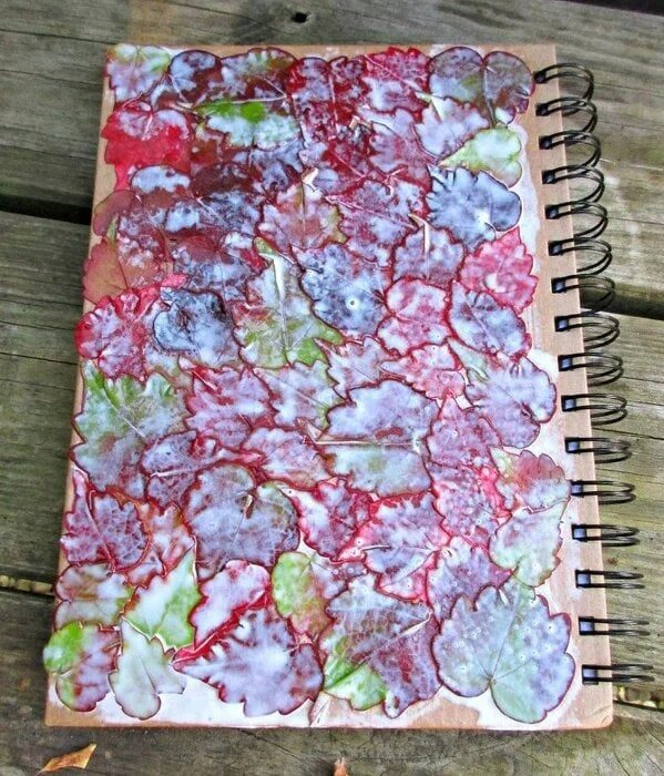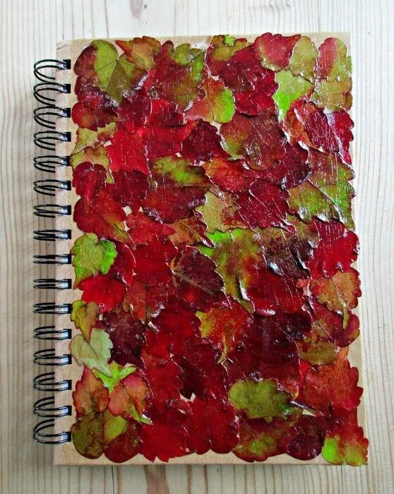 Технику декупажа можно выполнить не только с помощью бумажных салфеток, но и даже красивых опавших листьев! Например, ими можно задекорировать простенький блокнот.