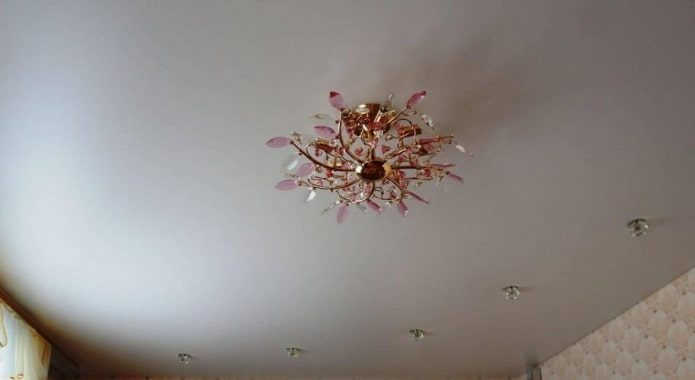 В натяжных потолках можно использовать любой тип освещения: точечные светильники или одиночную люстру. Они монтируются прямо в конструкцию. Но их мощность не должна превышать 60 Вт. Например, нежелательно использовать для подсветки такого покрытия: