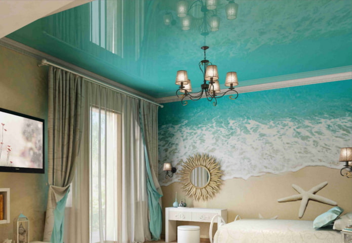 Самостоятельный декор. На пленку можно наносить краску, создавать различные изображения. Особенно выгодно смотрится натяжной потолок с фотопечатью, которая придает комнате неординарности.