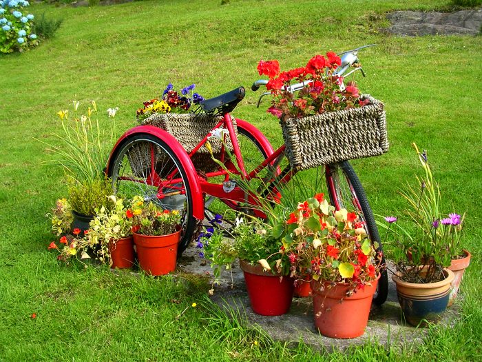 Современный сад — это не только цветы, посаженные просто в землю, а и оригинальные арт-композиции. Для их создания подойдут самые разные вещи. Например, вы можете использовать старый трехколесный велосипед, покрасить его в яркий цвет, а вокруг расставить цветочные горшки разного калибра.