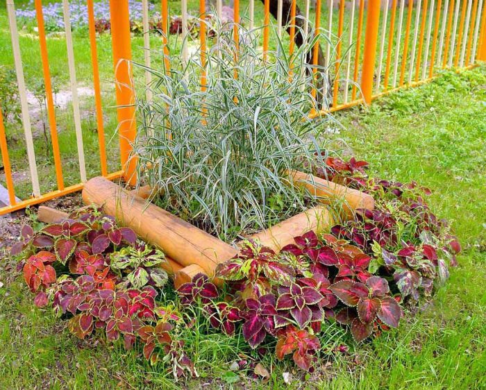 Прекрасный пример двустороннего цветника, построенного из небольших деревянных колод. Вся фишка таких клумб в подборе растений, которые будут внутри клумбы и снаружи.