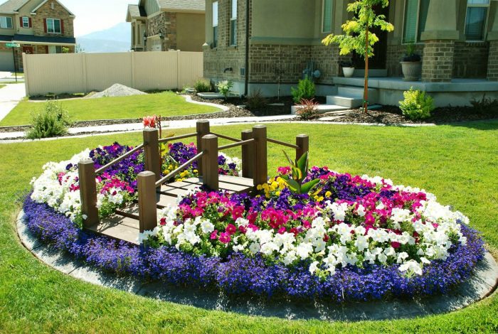 Цветочный остров — это достаточно сложная затея, которая потребует точности и терпения. Тем не менее, те, у кого хватит сил, получат эффектное украшение, которое не останется незамеченным в саду. Для композиции лучше использовать цветы нескольких оттенков и видов, а посередине можно разместить декоративный мостик.