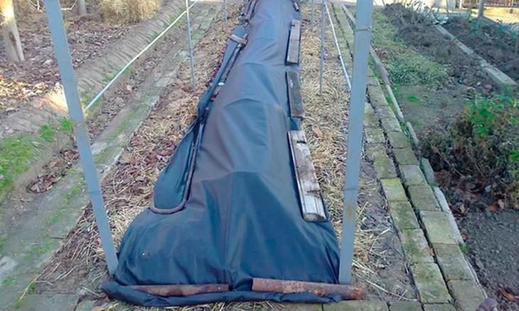 Сделать траншеи. В этом случае готовят углубления в 50–70 см. Побеги винограда скрепляют между собой и кладут сверху на настил (для этого можно использовать шифер). Затем лозу накрывают клеенкой, сверху насыпают землю. Зимой такое укрытие еще присыплет снегом, и оно хорошо будет держать тепло.