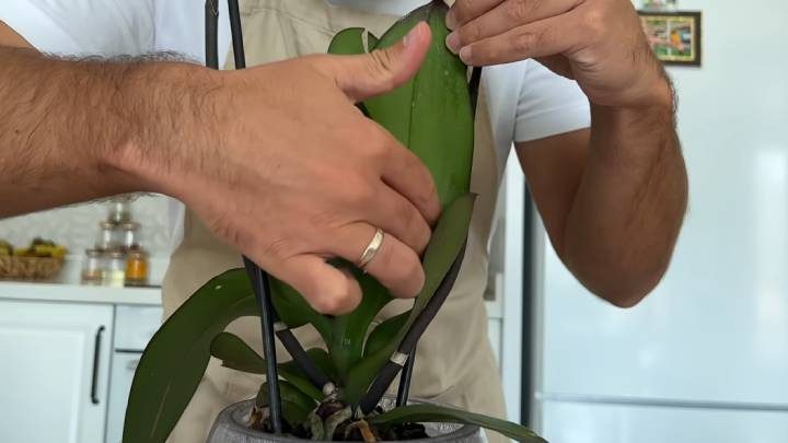 А также регулярно, хотя бы раз в 1-2 недели, протирайте листья с обеих сторон ватным диском, смоченным в растворе из 1 ст. л. молока и 2 ст. л. воды. Это очень недорогой, но эффективный уход за орхидеей!