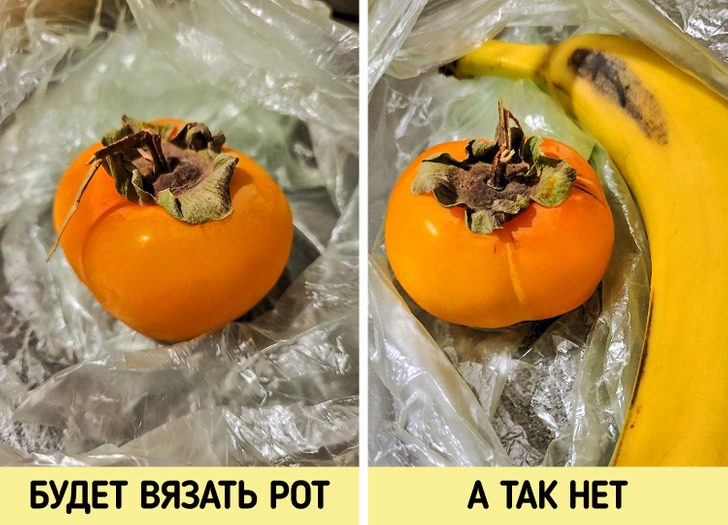 Чтобы хурма не вязала рот, уберите ее в один пакет с бананом и подождите. Банан будет выделять этилен, который поможет хурме дозреть