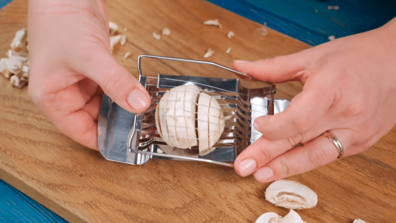 При помощи обычной яйцерезки грибы можно не только быстро нарезать на слайсы, но и превратить в соломку.