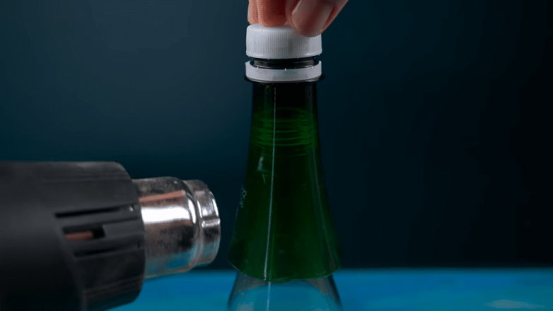 Предпочитаете хранить масло в стеклянной бутылке, а крышка на ней оказалась неудобной или просто потерялась? Не огорчайтесь. Все поправимо. Достаточно срезать верх от пластиковой бутылки подходящей формы, разместить на стеклянной и воспользоваться мощным феном. Разогретый пластик даст усадку и плотно зафиксируется на стекле.