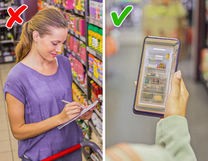 Чтобы придерживаться плана, как минимум неплохо составлять список покупок перед походом в магазин. Однако еще лучше сфотографировать содержимое своего холодильника. Так можно будет перепроверить, покупку каких продуктов еще можно отложить, например, если не нашлось любимой марки масла или привычного сорта яблок, а какие закончились полностью и откладывать возможности уже нет. Кроме того, в процессе закупок нередко вспоминаются дополнительные пункты и с помощью фото можно будет уточнить, точно ли у вас нет нужного соуса или вы просто давно не пользовались им и забыли, что он стоит на полке.