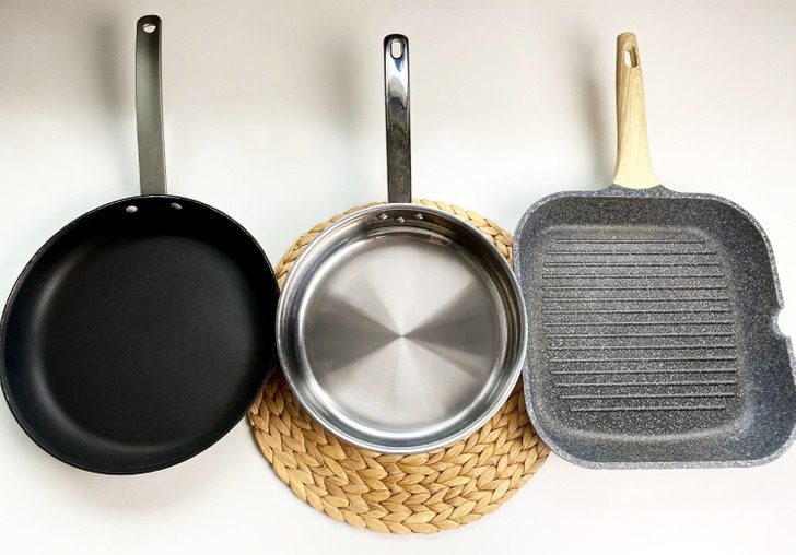 Из нержавеющей стали: используют профессионалы, долговечны, еда готовится равномерно, при нагревании не выделяются вредные вещества. Но если жарить на ней без масла, блюдо может пригореть.