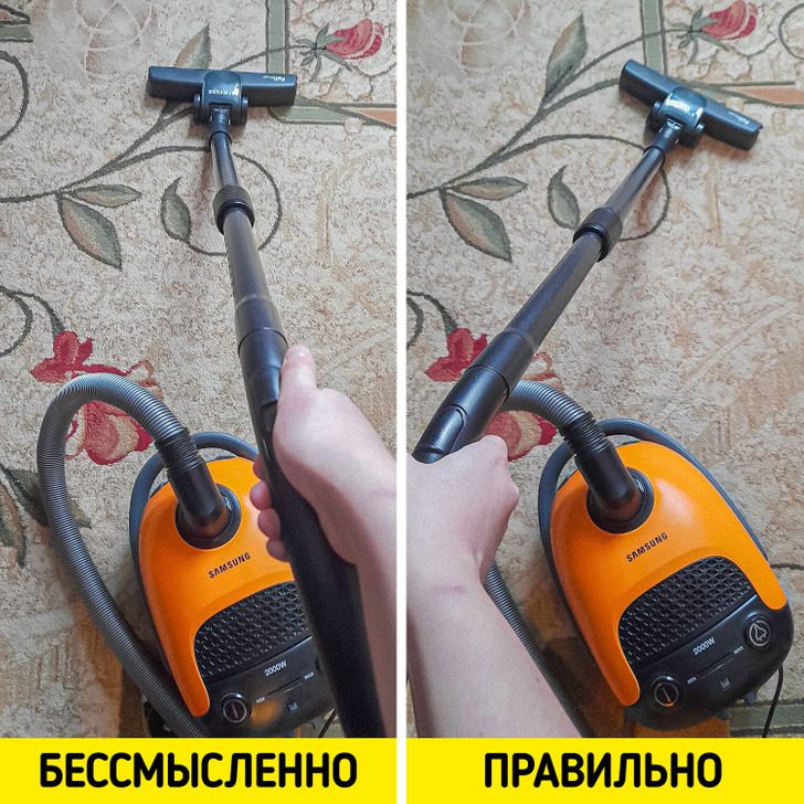 Бытовало мнение, что пылесосить ковры нужно в одном направлении. Но это лишь превращает уборку в пустую трату времени, ведь пыль и грязь могут «прятаться» в волокнах ковра. Чтобы очистить их полностью, следует двигать щетку пылесоса вперед-назад и слева направо.