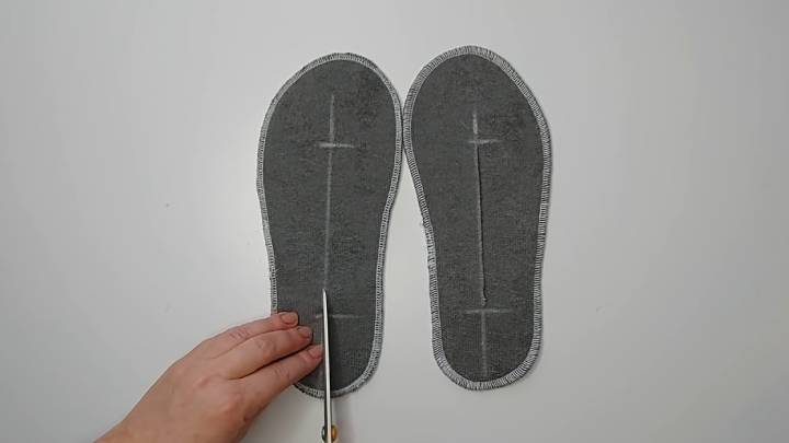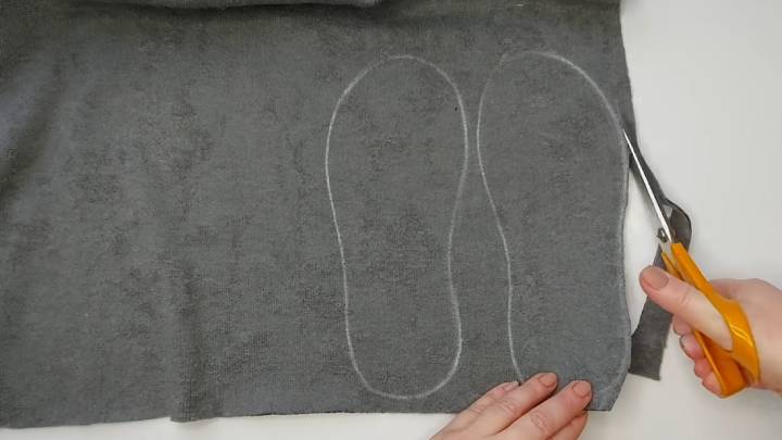 Приложите к ткани домашние тапочки, которые вам идеальны по размеру. Вырежьте обе стороны. На пару следков потребуется 4 таких заготовки. Сложите две заготовки вместе рисунком внутрь, прошейте на машинке оверлоком по краю. Не оставляйте отверстие для выворачивания. Сделайте то же самое со второй парой.