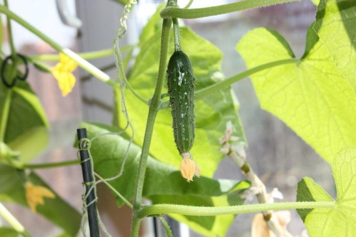 Ночью температура для огуречной рассады должна быть 15-17 градусов, а днем не более 20-22 единиц. Оптимальный световой день 12-16 часов. Поэтому эту культуру нужно досвечивать лампой. Также домашние огурцы на подоконнике требуют подвязки. Можно подвешивать их плоды к оконной конструкции. Это необходимо для правильного распределения света.
