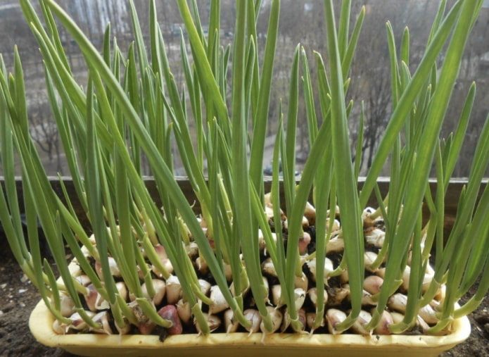 Перед помещением в субстрат лук необходимо замочить. После посадки его нужно на 10 суток поместить в прохладное темное место. Это ускорит формирование корневой системы. Затем перенести молодо й лук на светлый подоконник с южной стороны. После прорастания ростки можно периодически опрыскивать.
