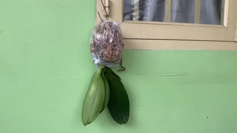 Подвесьте орхидею листьями в низ в прохладном и хорошо проветриваемом месте. Раз в 2 дня обязательно опрыскивайте листья чистой водой.