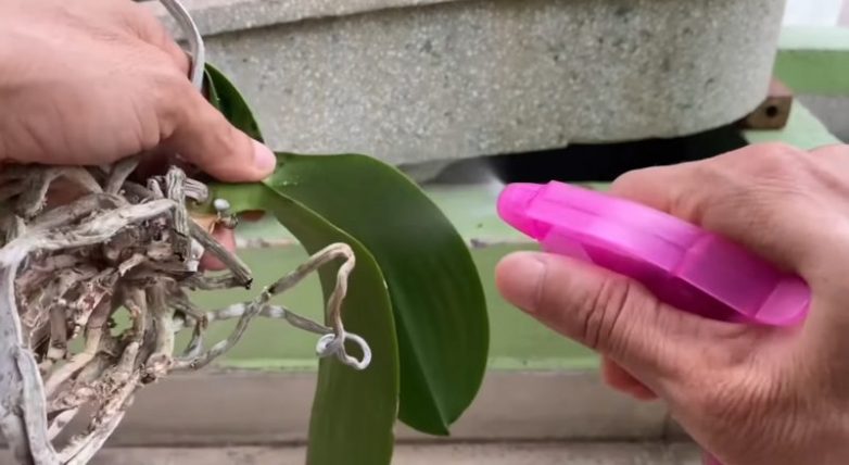 Опрыскайте листья водой и аккуратно протрите их мягкой тканью. Оставьте орхидею в прохладном сухом месте на 1 день.