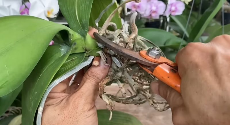 Прежде чем приступать к восстановлению орхидеи этим абсолютно новым методом следует прекратить полив растения. Через неделю после последнего полива извлеките орхидею из горшка, удалите старый посадочный материал и обрежьте засохшие и поврежденные корни.