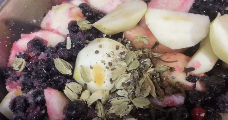 Сначала подготавливаем все ингредиенты: рябину очищаем от веточек и мусора, хорошо промываем, яблоки очищаем от шкурки и сердцевины и нарезаем небольшими дольками. Пересыпаем все сахаром и перемешиваем. Также при желании добавляем специи, в нашем случае используются кардамон, гвоздика и корица.