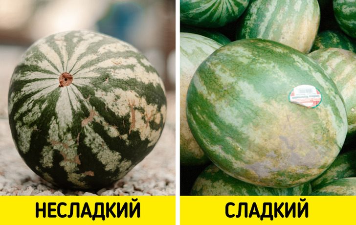 Мягкие участки на корке — признаки не самого вкусного арбуза. Вместе с тем наличие желтых и коричневых пятен говорит об особой его сладости. Такие «несовершенства» появляются там, где излишки сахара раньше просачивались сквозь корку.