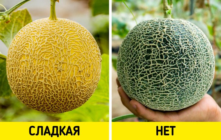 Спелые и сладкие дыни всегда ярко-желтого цвета. Плоды светло-желтого или зеленоватого оттенка обычно незрелые, а слишком мягкая кожура указывает на их низкое качество.