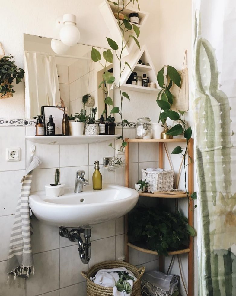 Если ванная комната совсем небольшая, то не стоит в нее ставить слишком много мебели. Только самое необходимое и желательно даже отказаться от тумбочек, лучше выбрать несколько открытых полок.