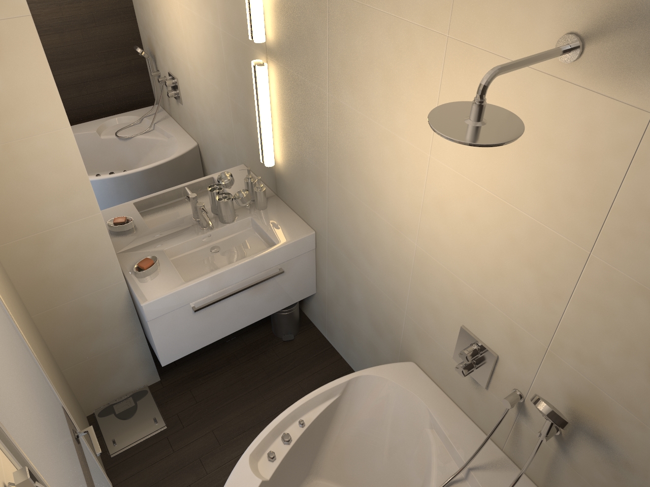 Комната и так небольшая, а когда в ней мало света она кажется еще меньше. Поэтому продумайте освещение не только верхнее, но и возле зеркала, ванной и в других важных зонах.