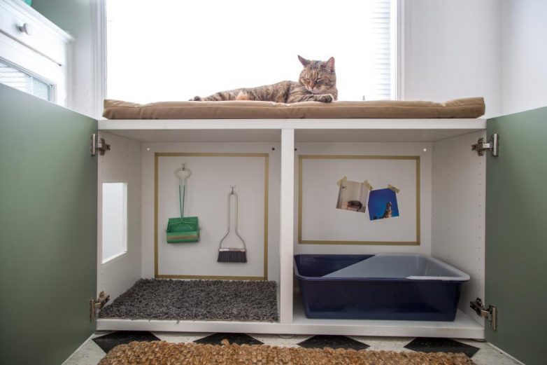 Самое неприятное место в ванной комнате или в санузле – это кошачий туалет, который еще и издает запахи. Скрыть его можно, если переделать тумбу под эту необходимость. Главное, чтобы питомец смог туда пробраться, обычно для этого заднюю часть тумбы оставляют открытой.
