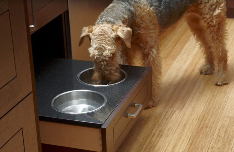 Чтобы миски не мешались под ногами, стоит выделить на кухне или в прихожей ящик и сделать в нем встроенный модуль для мисок. Так вы решите сразу две проблемы: хранение и эстетический вид.