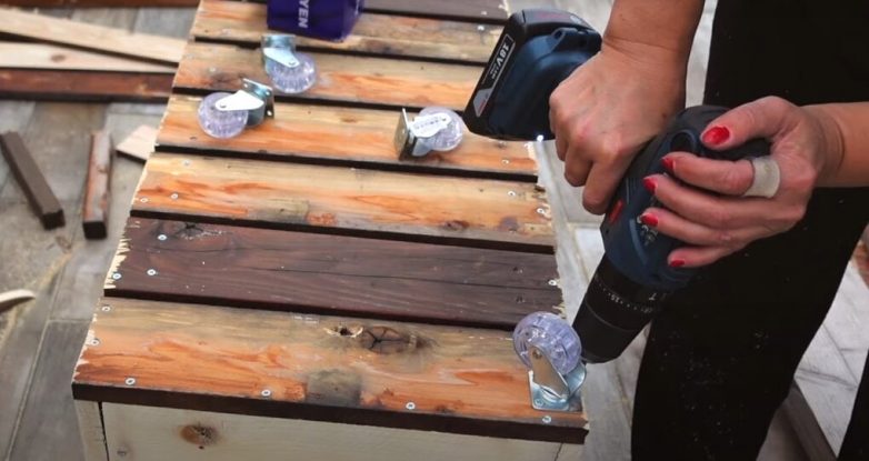 Соберите из досок нижнюю часть ящика и прикрутите к основанию колесики.