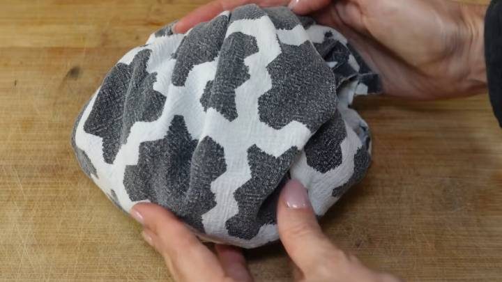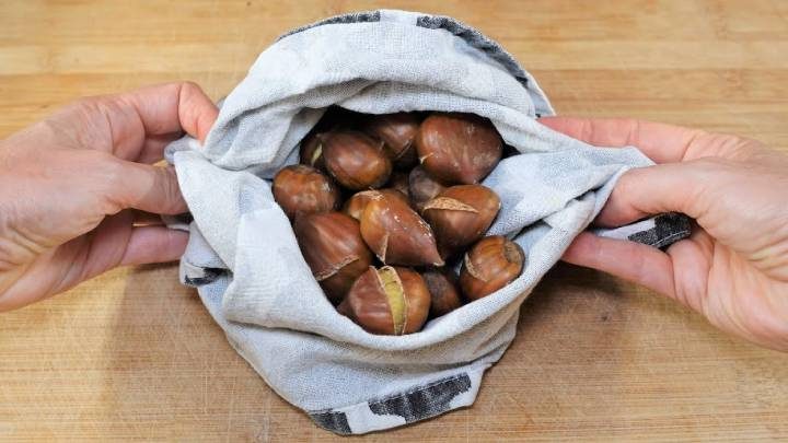Ещё горячие каштаны осторожно переложите в полотенце. Замотайте и оставьте до полного остывания (чтобы были слегка тёплыми).