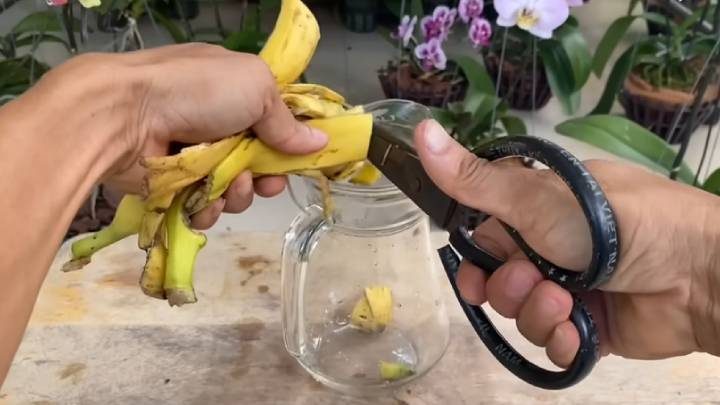 Нарежьте три шкурки от банана ножницами или ножом в чистую банку.