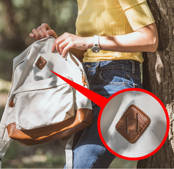 У многих рюкзаков спереди есть ромбовидная нашивка с 2 продольными разрезами. Она называется «свиной пятачок». Но придумали ее отнюдь не для украшения. Изначальная функция «пятачка» — облегчить жизнь туристам и велосипедистам. Через прорези можно с легкостью продеть веревку или шнурок, а на них подвесить фонарик, фляжку или другой необходимый предмет. Если вы не турист, то, как вариант, можно подвешивать к рюкзаку за шнурки вторую пару обуви или кроссовки для занятий в зале.