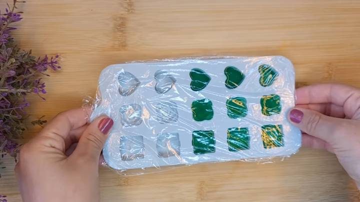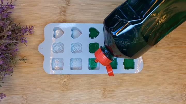 Разлейте жидкость для мытья посуды в силиконовую форму. Закройте плёнкой, отправьте в морозилку на 2 часа.
