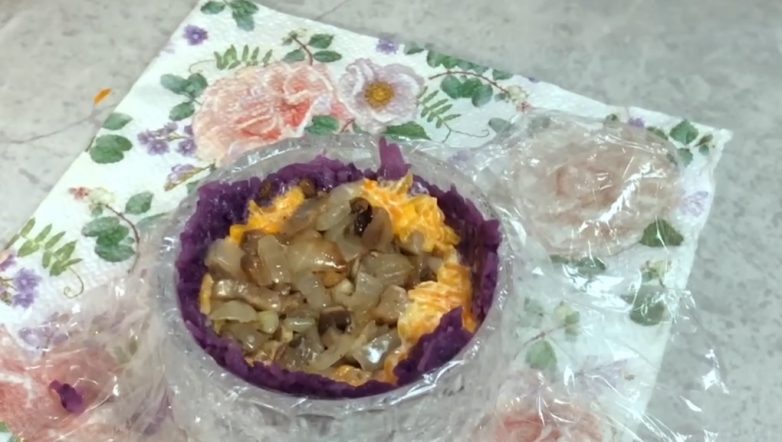 Для формирования закуски в небольшой стакан поместите пищевую пленку. Первым слоем выложите в стакан картофель и равномерно распределите его по дну и стенкам емкости. Вторым слоем выложите морковь, а затем грибы с луком.