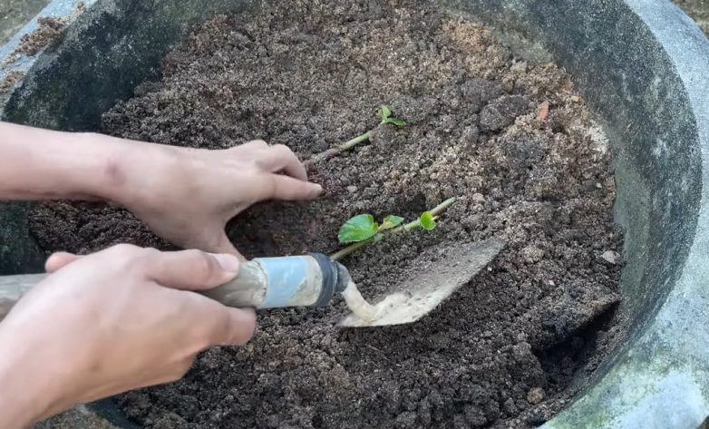 Присыпьте черенки небольшим количеством земли и обильно полейте их водой.