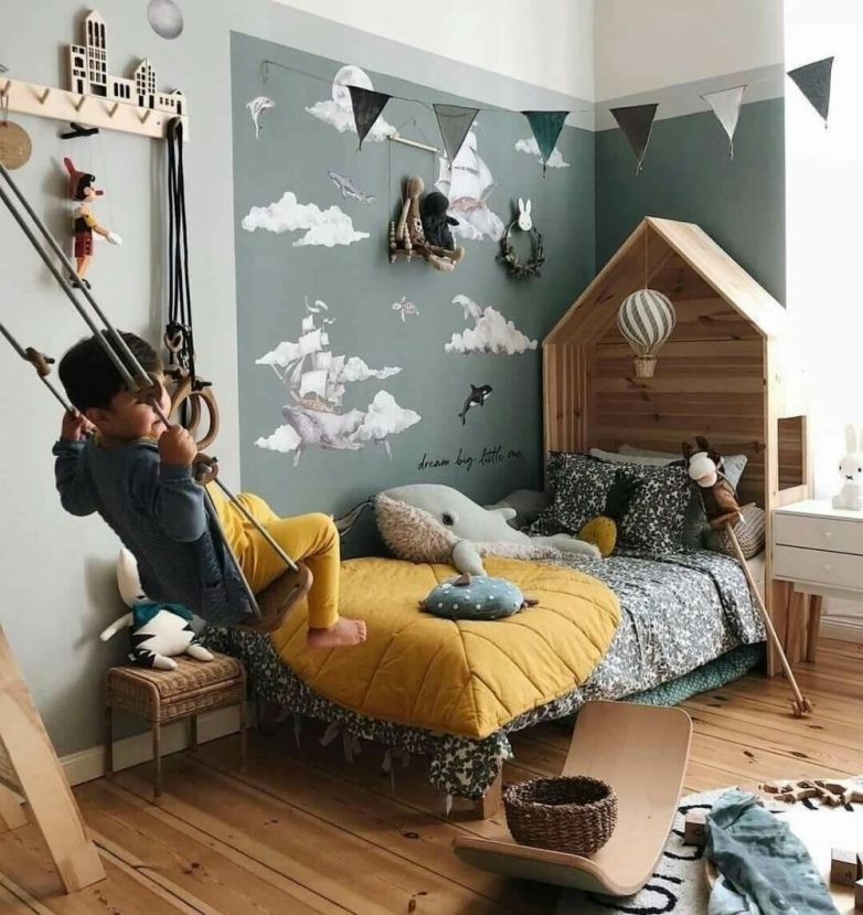 Если детская комната длинная, но узкая, то ради разнообразия в интерьер можно добавить качели. Дети будут в восторге от такого решения. Главное – это убедиться в надежности крепления механизма.