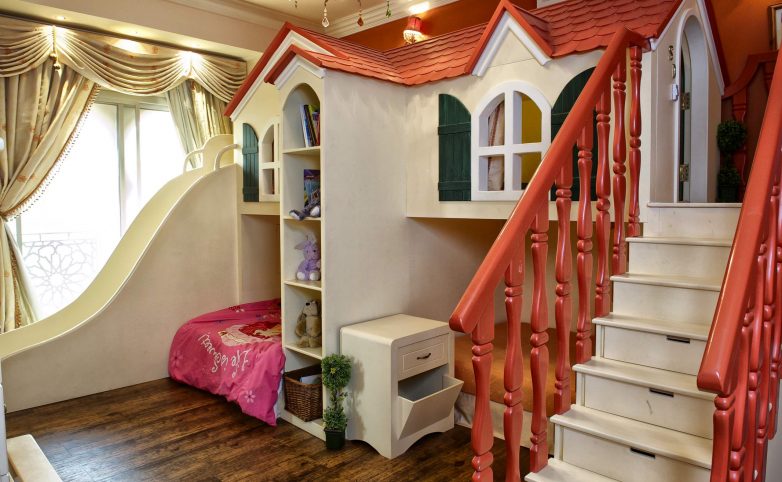 Решить все проблемы сразу можно при помощи многофункционального домика, который отлично поместится в небольшую детскую. В этом домике есть все: место для сна, игр, горки, полки и ящики.