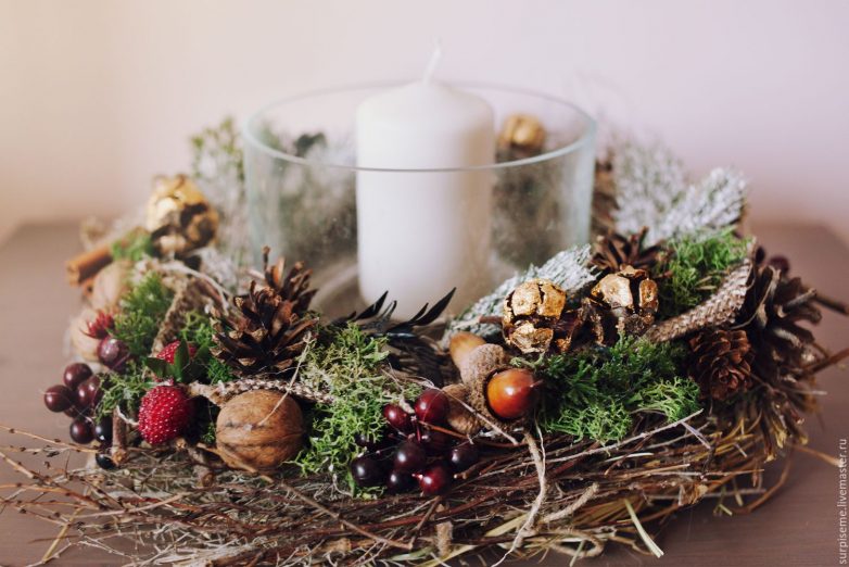 Еще в 2023 году стоит для декора выбирать натуральные материалы. Ветки, дерево, камни, сухоцветы, шишки, желуди – из них можно сделать красивую новогоднюю инсталляцию, которая украсит ваш праздничный стол.