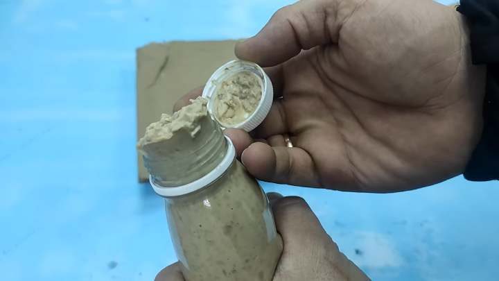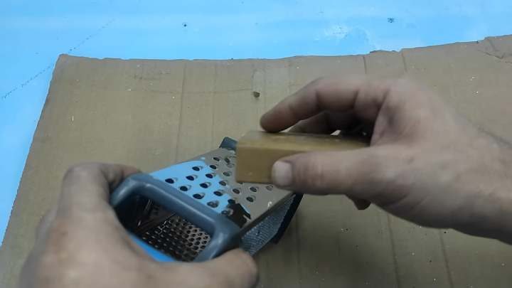 Натрите кусок хозяйственного мыла на тёрке. Пересыпьте мыльную стружку в сухую и чистую пластиковую бутылку. Залейте бензином либо спиртом так, чтобы только слегка покрывало сверху мыло. Закройте крышкой, потрясите минутку, оставьте, пока мыло максимально не размягчится.