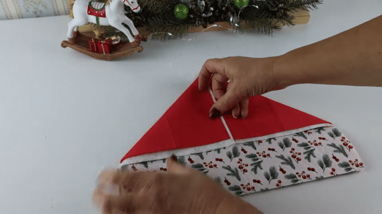 Начнем с колпачка. Для его создания понадобится 2 больших салфетки: красная и с рисунком. Для начала разворачиваем обе салфетки и укладываем цветную поверх красной. Подгибаем верхние края к середине.